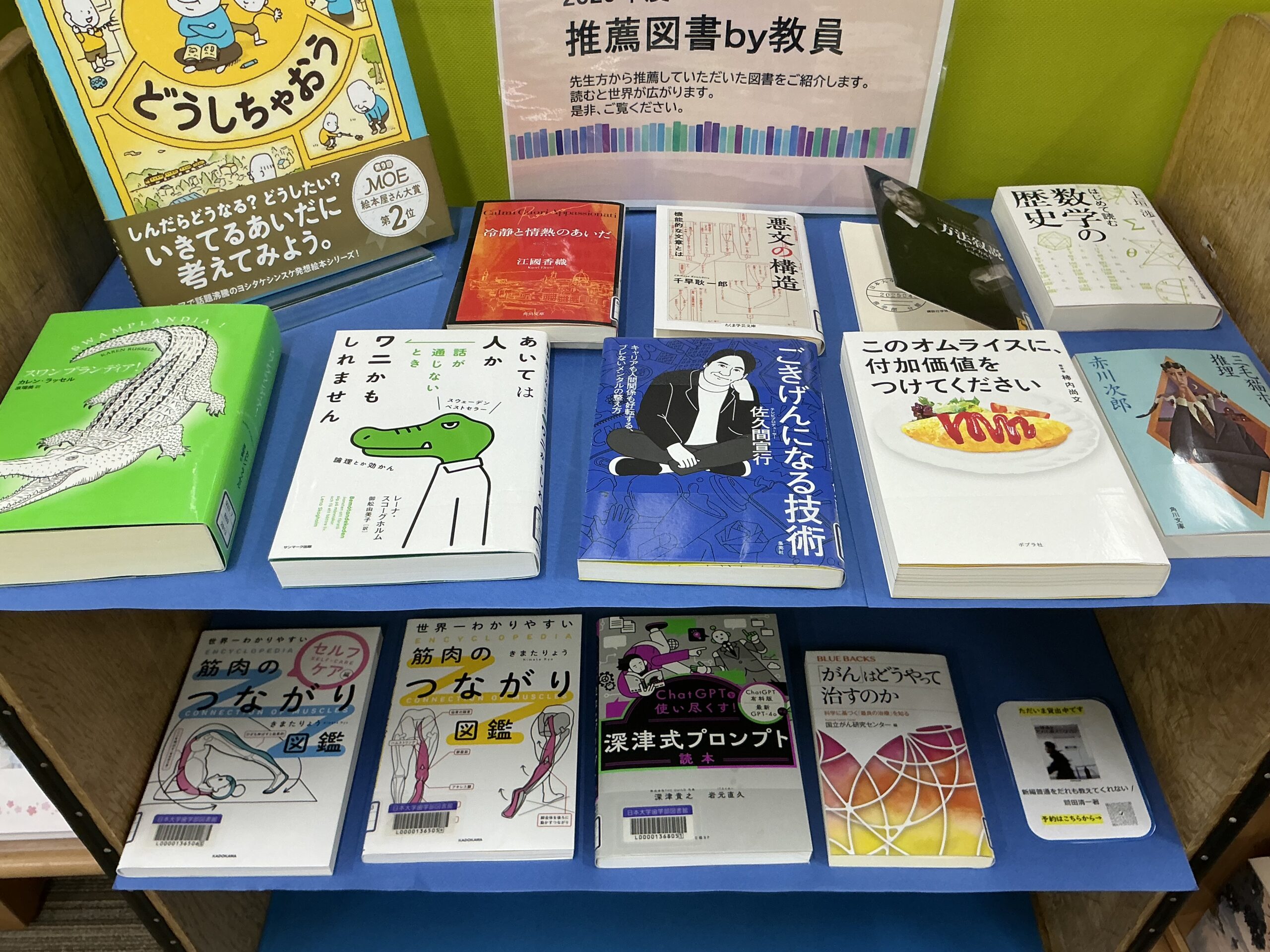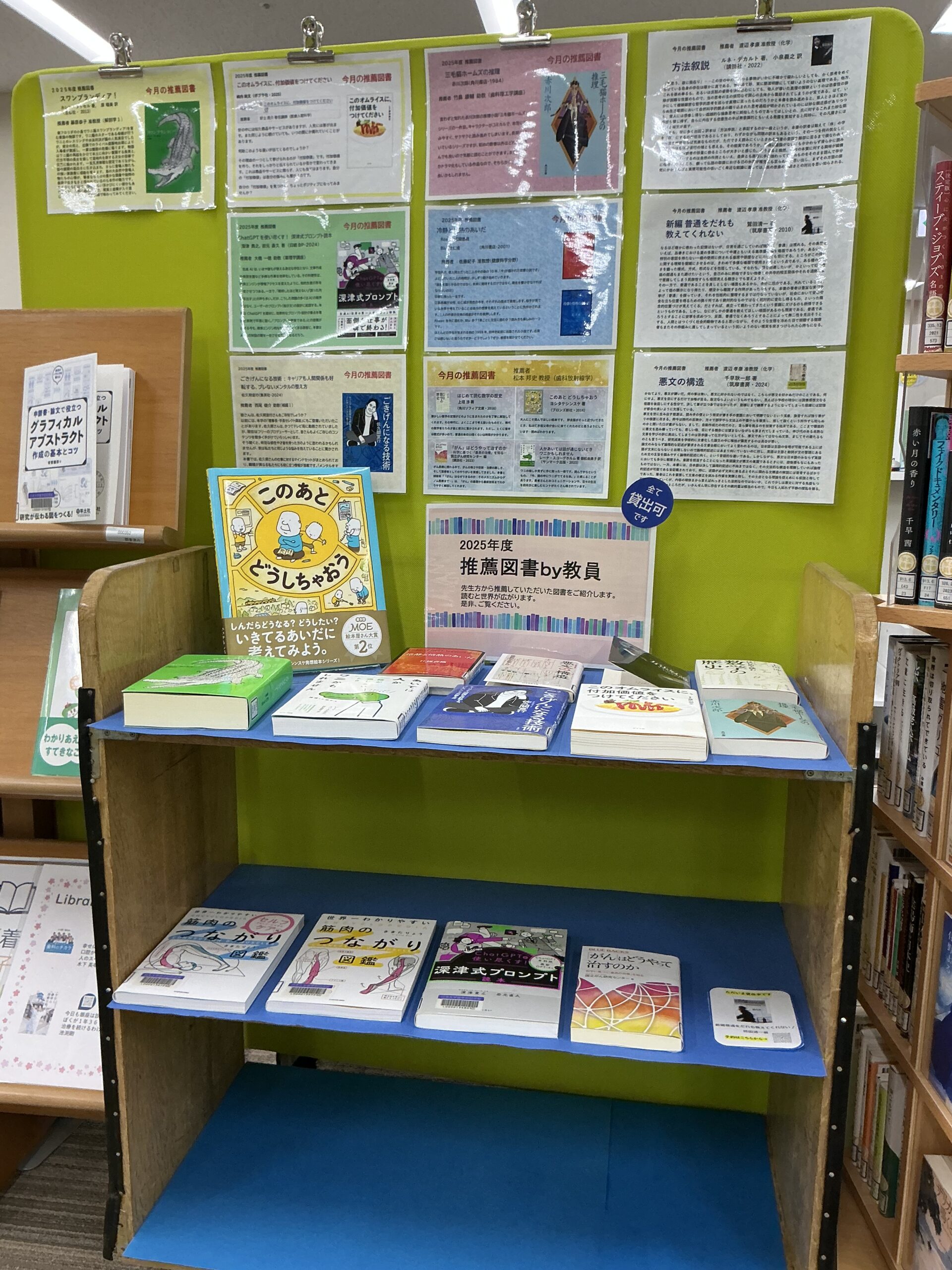 ここ1年間(くらい)の推薦図書をカウンター前に集めてみました。すべての本にコメントが付いており、「あの先生がこのような本をお勧めしている!?」等の発見があるかもしれません。ぜひごらんください。