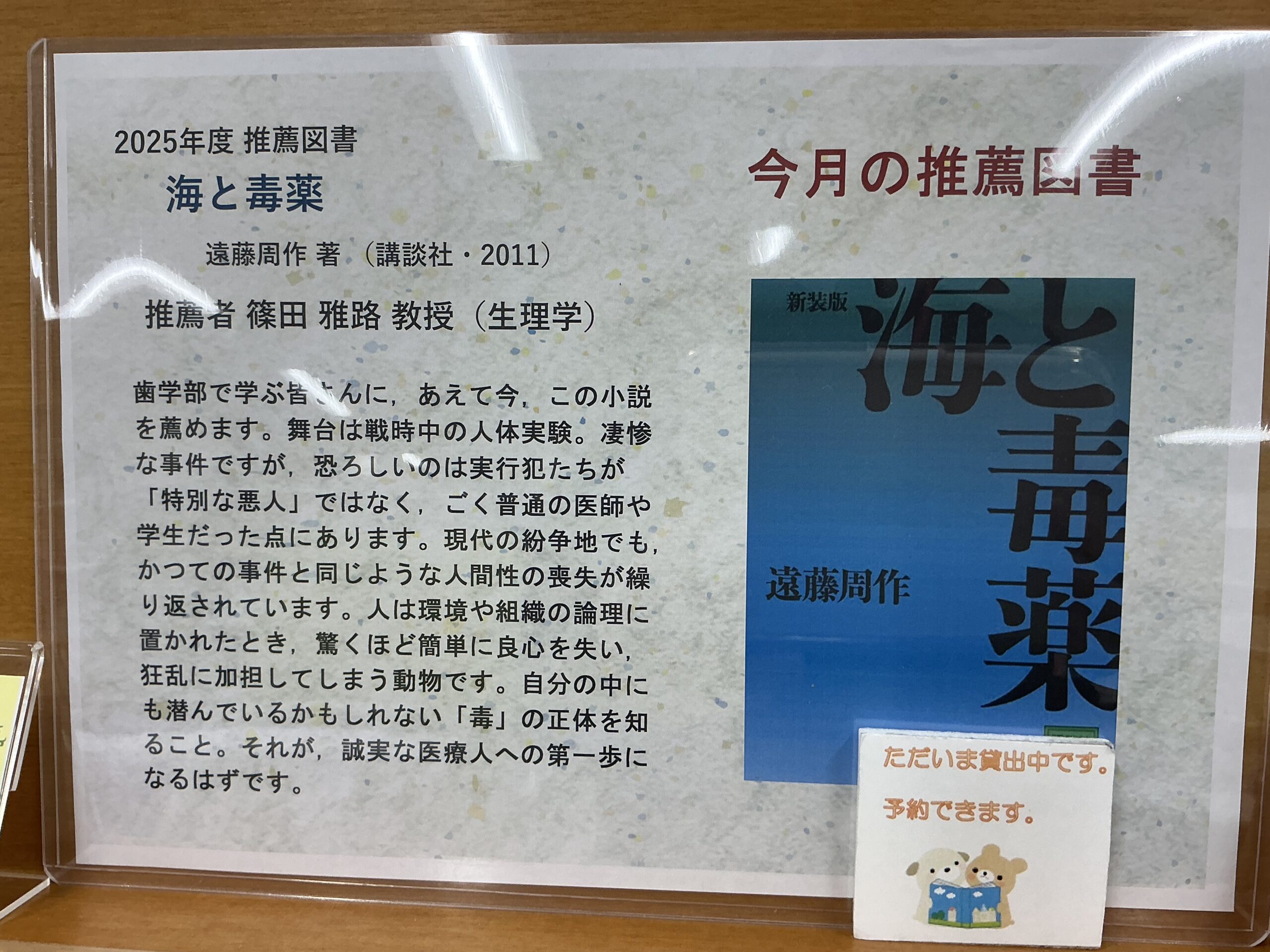 篠田先生(生理学)がおすすめする「海と毒薬」重ーい内容ですが読みやすいです